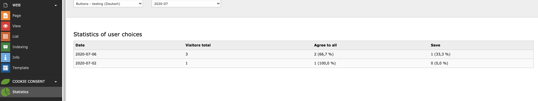 If you enable statistics, the chosen cookie consent gets collected in the Cookie Statistics backend module.
