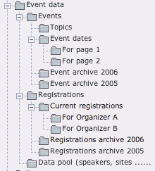 The following system folder structure is proposed for a full-blown installation with lots of events and different organizers that manage their registrations independently: