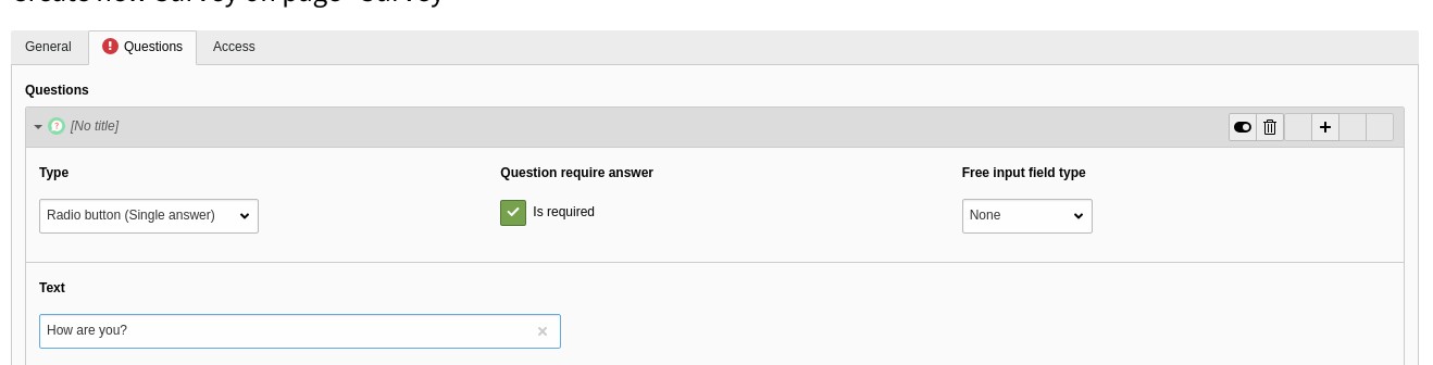 - Each question has 3 options: Radio button, Checkboxes, Input field