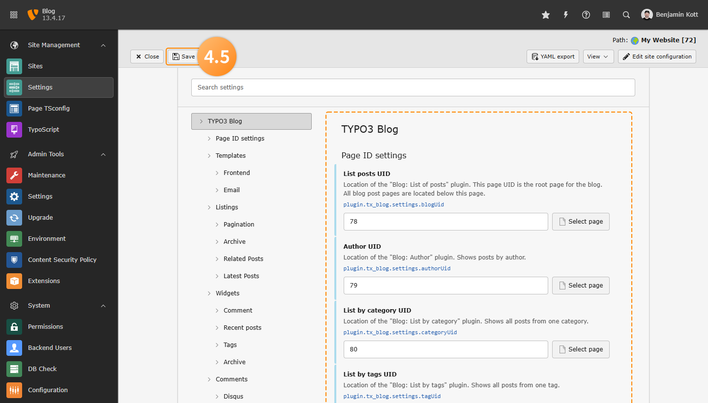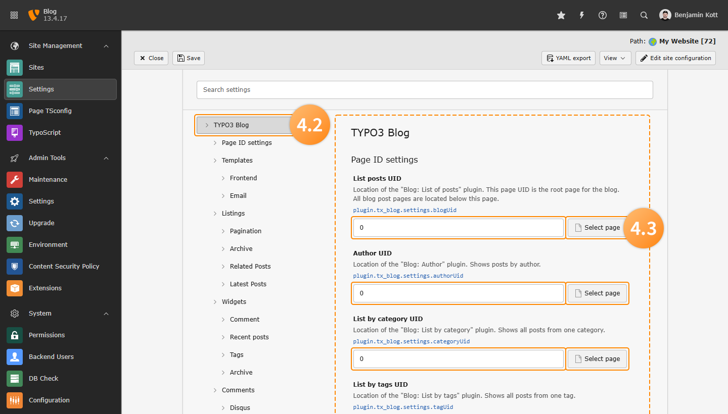 plugin: tx_blog: settings: blogUid: ID_of_Page_Blog categoryUid: ID_of_Page_Categories tagUid: ID_of_Page_Authors authorUid: ID_of_Page_Tags archiveUid: ID_of_Page_Archive storagePid: ID_of_Page_DataCopied!
