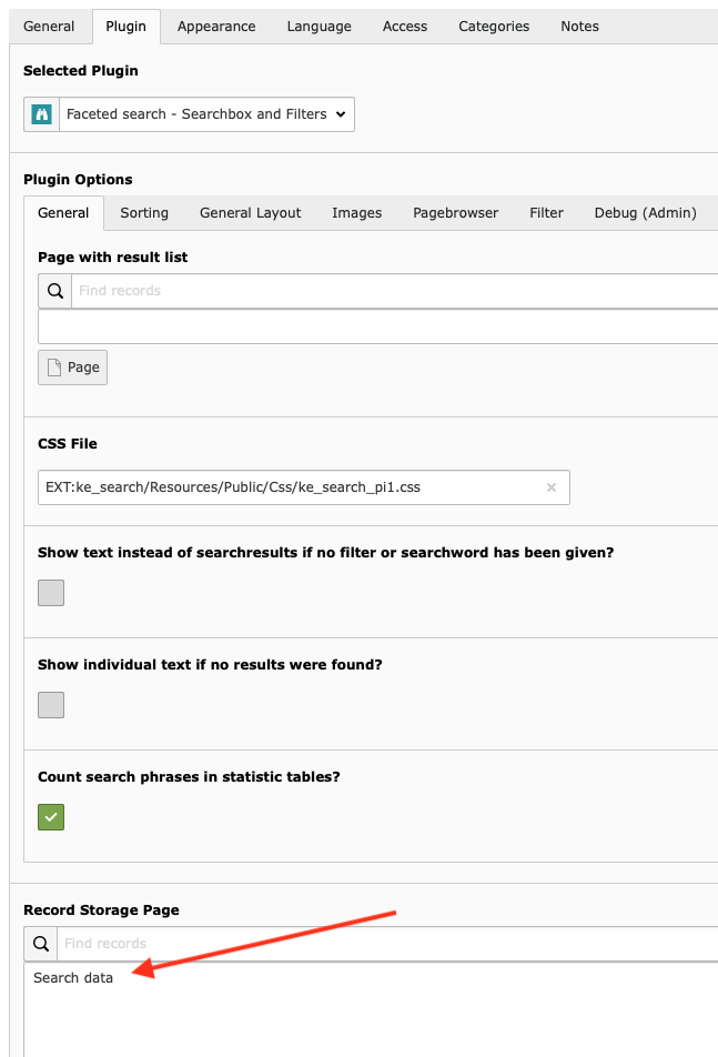 Fill in the field “Record Storage Page” in the Tab “Plugin” -> “General” with the Systemfolder that you created in step 2 (our example: ‘Search data’).