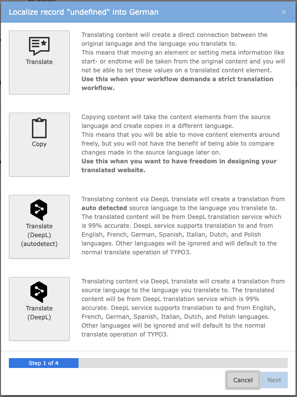 Once the extension is installed and the API key provided, we are ready to start translating content elements. When translating a content element, there are four additional options besides the normal translate and copy.