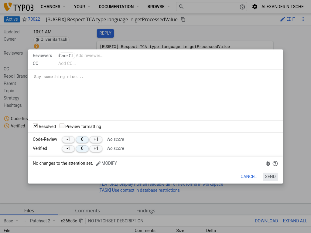 Click on Send and your comments will be saved. At the same time all other contributors who either watched this change or have already voted on this change will get notified.
