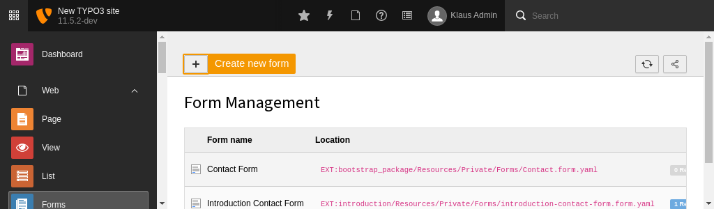 - In the Content > Forms module, click the + Create new form button.