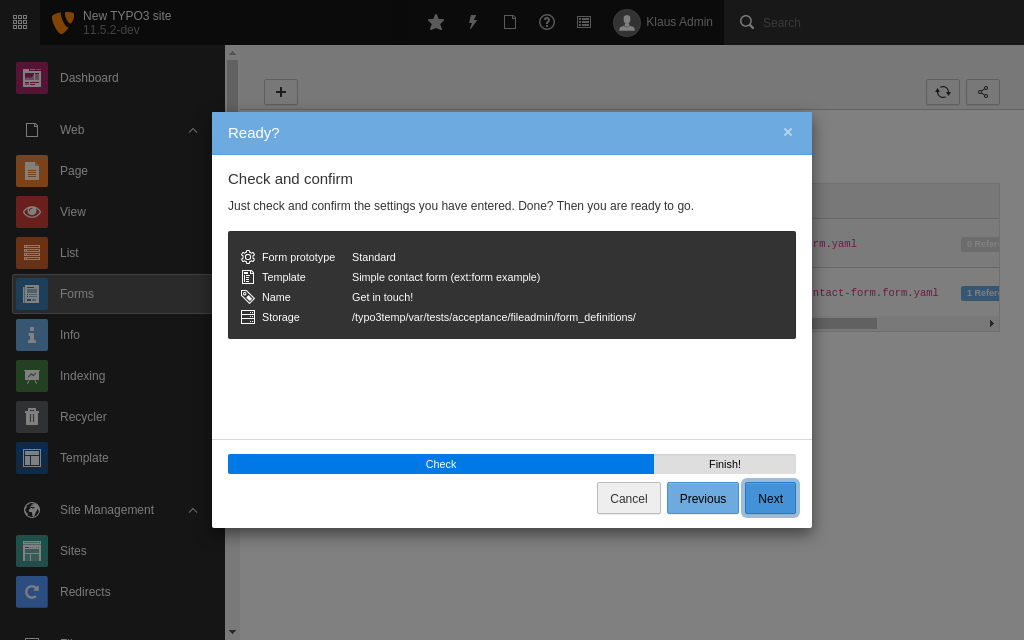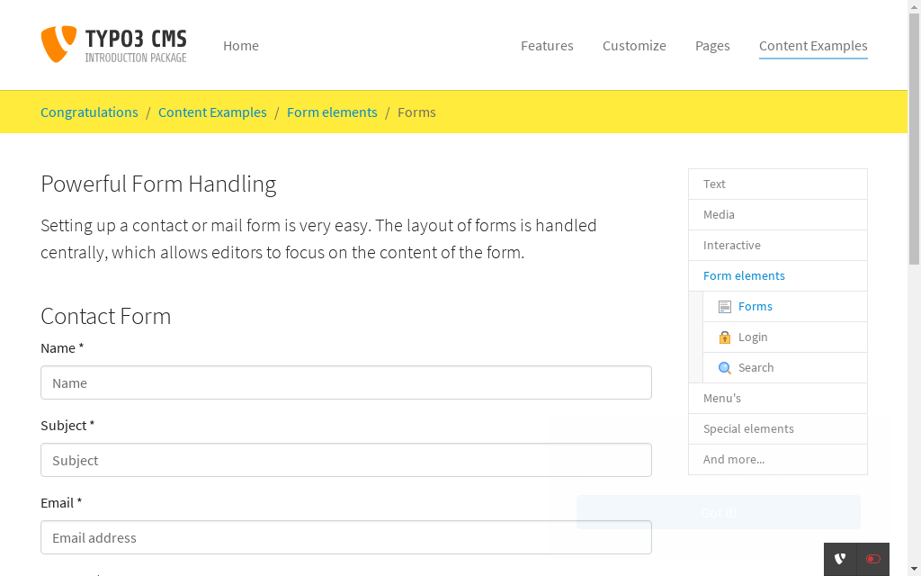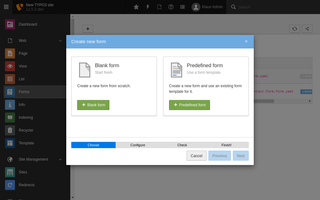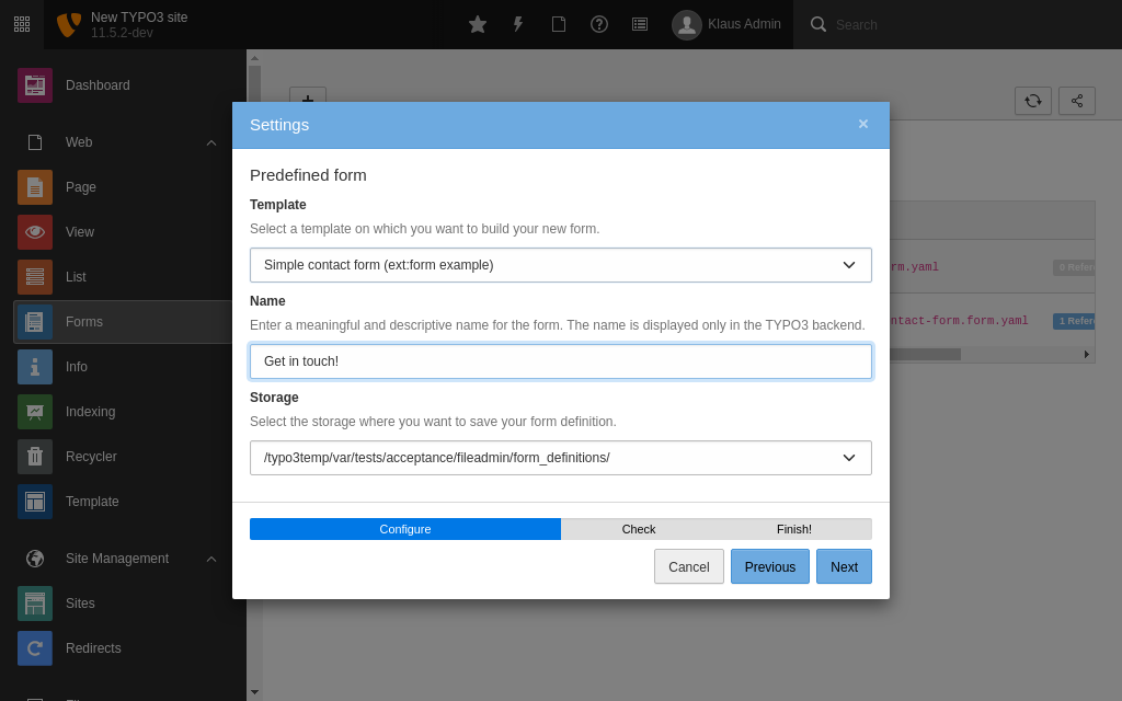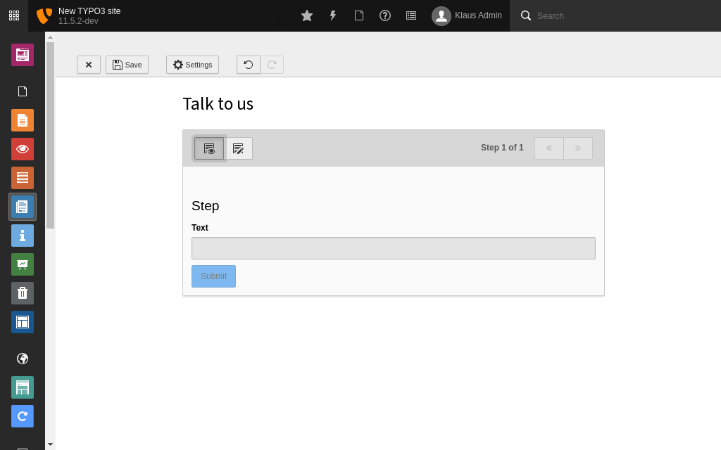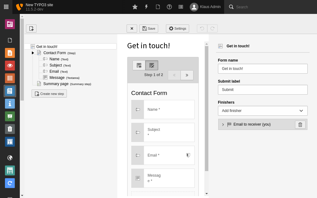 This module provides a guided interface for editors to create any kind of form such as a contact form, newsletter subscription or even a survey. TYPO3 comes with one pre-defined form already built, which you can use to get started.