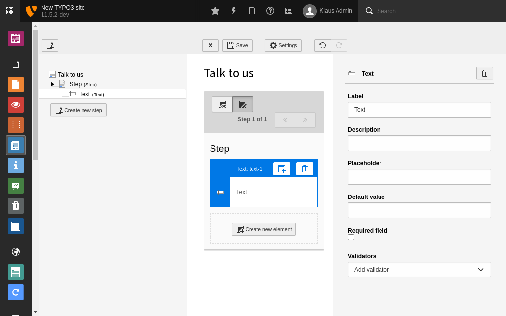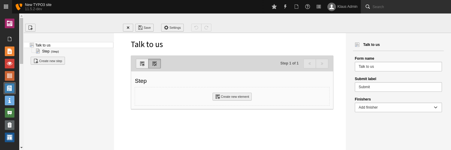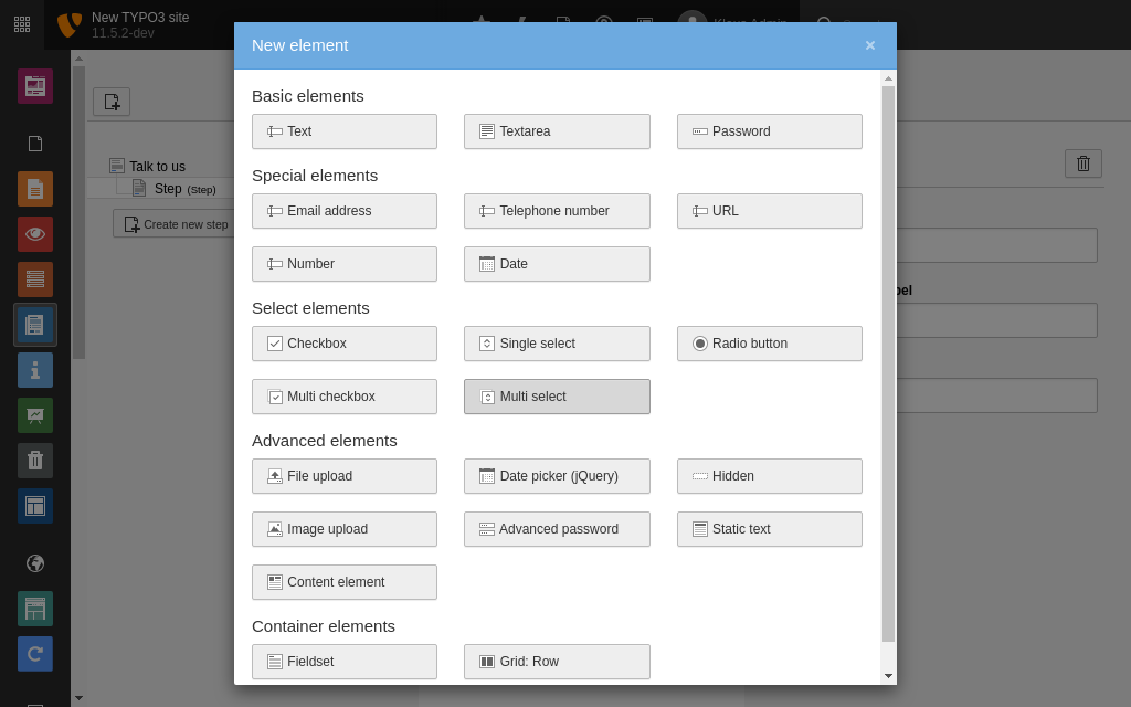 Click the Create new element button. The New element window displays.   Create new element in form TYPO3 comes with over twenty form fields by default, including: - Basic elements like text or password fields